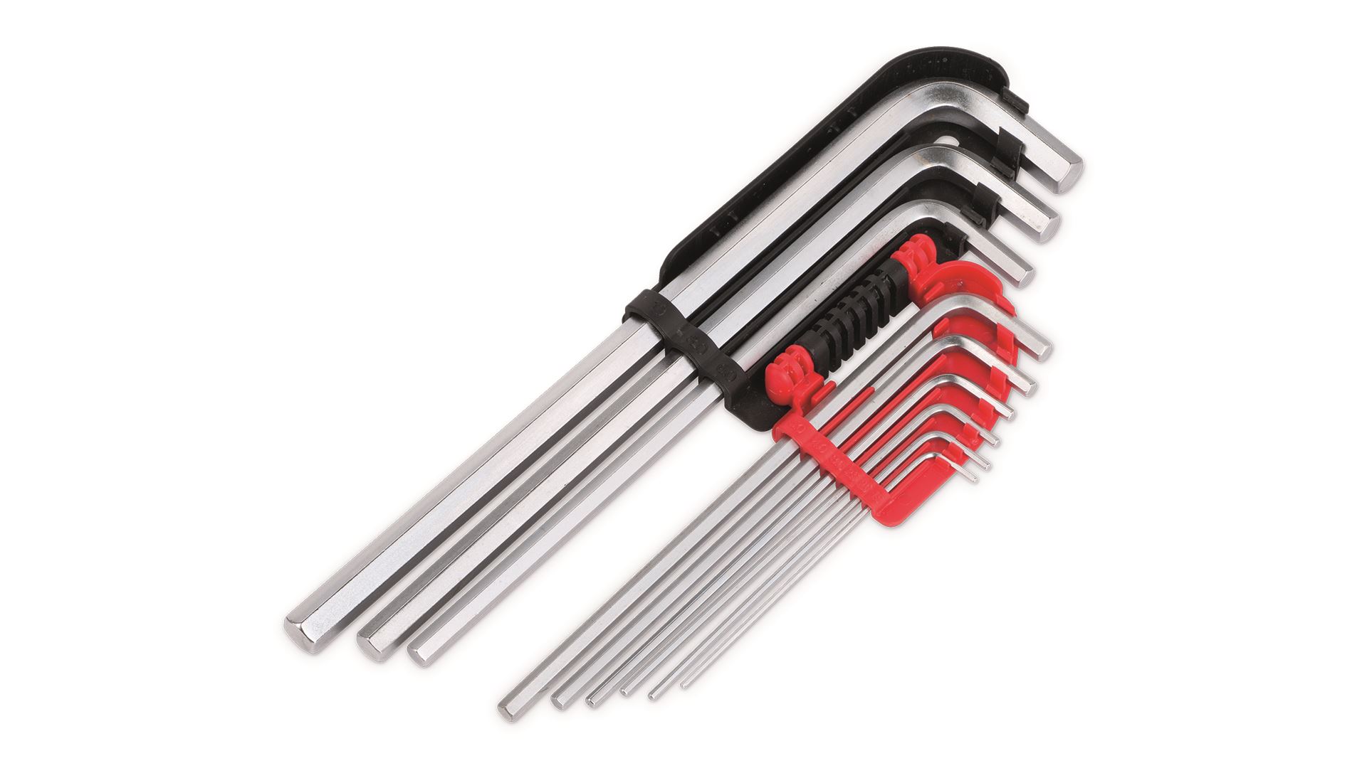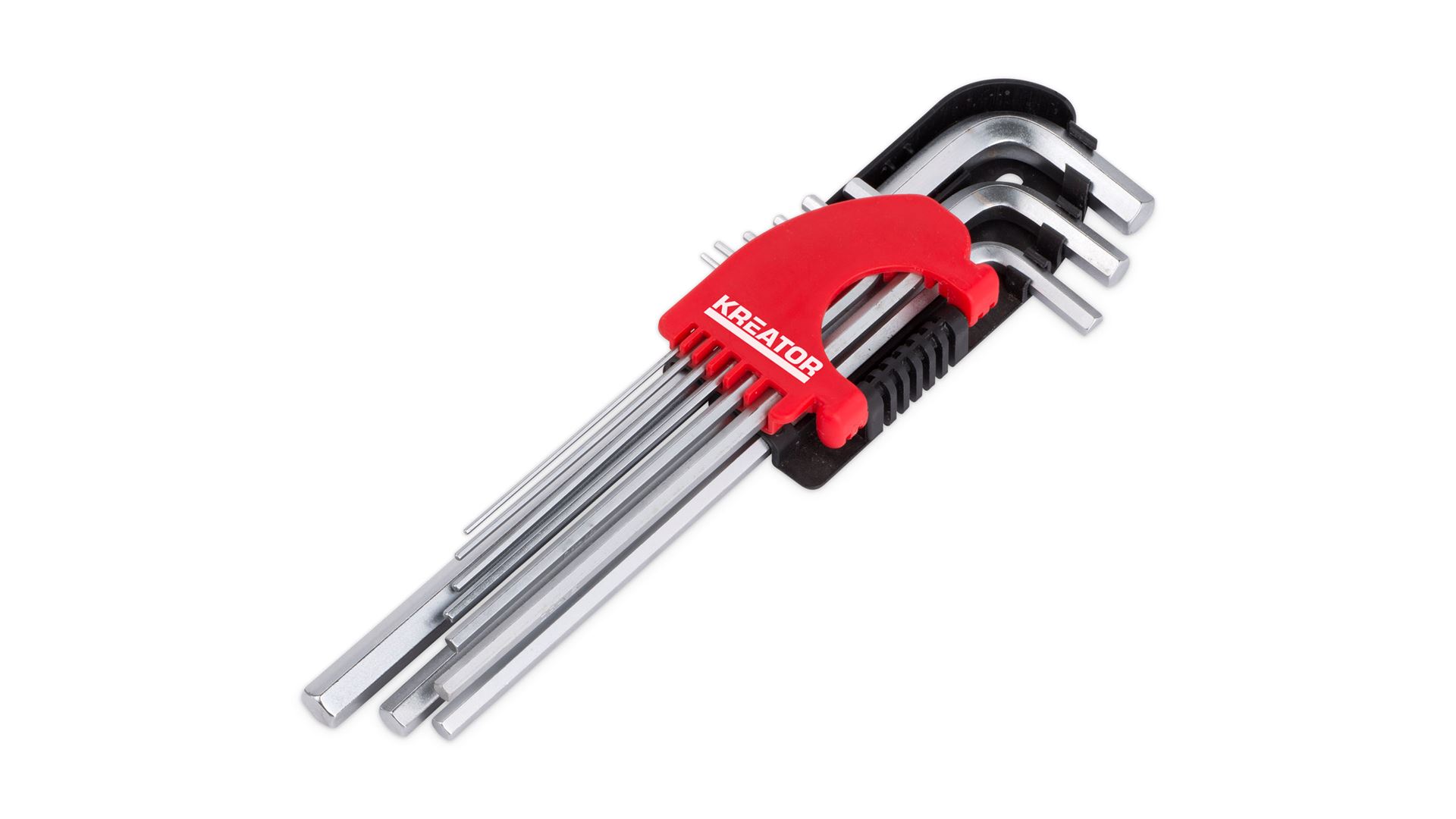 Ez a Kreator készlet 9 db hosszú, L alakú imbuszkulcsot tartalmaz, amelyek átmérője 1,5 és 10 mm között van. A kulcsok praktikus műanyag tokban kaphatók a könnyű tárolás érdekében.