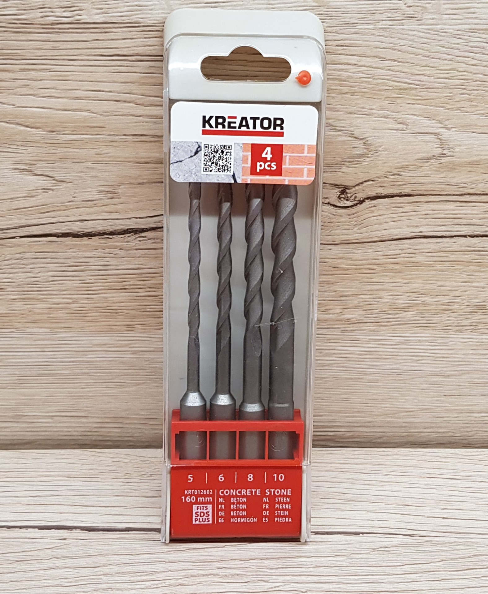 Ez a 4 darabos készlet SDS plus fúrófejeket tartalmaz kőbe vagy betonba való fúráshoz. A fúrók hossza 160 mm, átmérőjük pedig 5, 6, 8 és 10 mm.