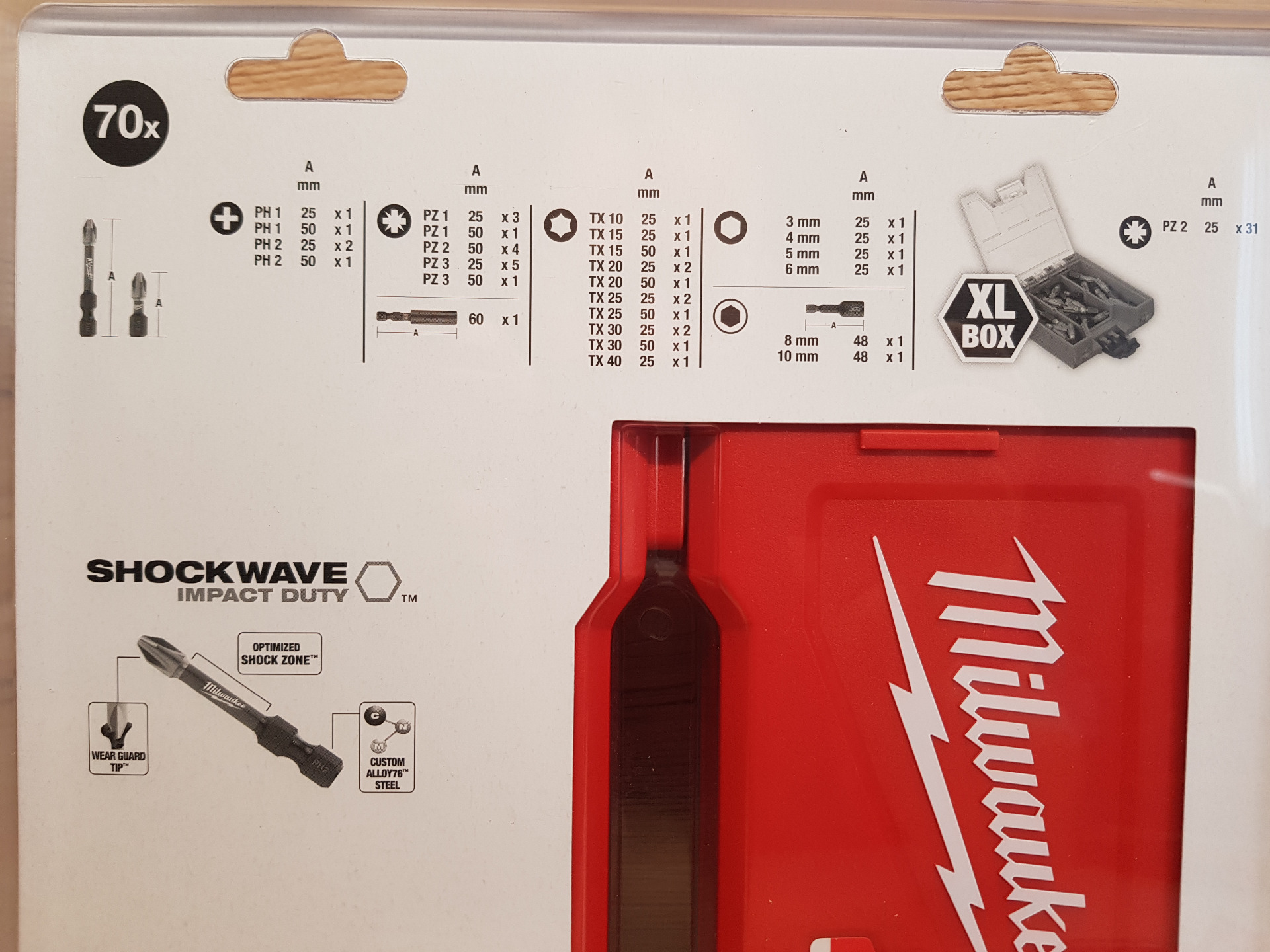 SHOCKWAVE™ csavarozó bitek: 55 x 25 mm hosszú 1 x PH1 / 2 x PH2, 3 x PZ1 / 31 x PZ2 / 5 x PZ3, 1 x TX10 / 1 x TX15 / 2 x TX20 / 2 x TX25 / 2 x TX30 / 1 x TX40, 1 x Hex 3 mm / 1 x Hex 4 mm / 1 x Hex 5 mm / 1 x Hex 6 mm. 12 x 50 mm hosszú 1 x PH1 / 1 x PH2, 1 x PZ1 / 4 x PZ2 / 1 x PZ3, 1 x TX15 / 1 x TX20 / 1 x TX25 / 1 x TX30.
